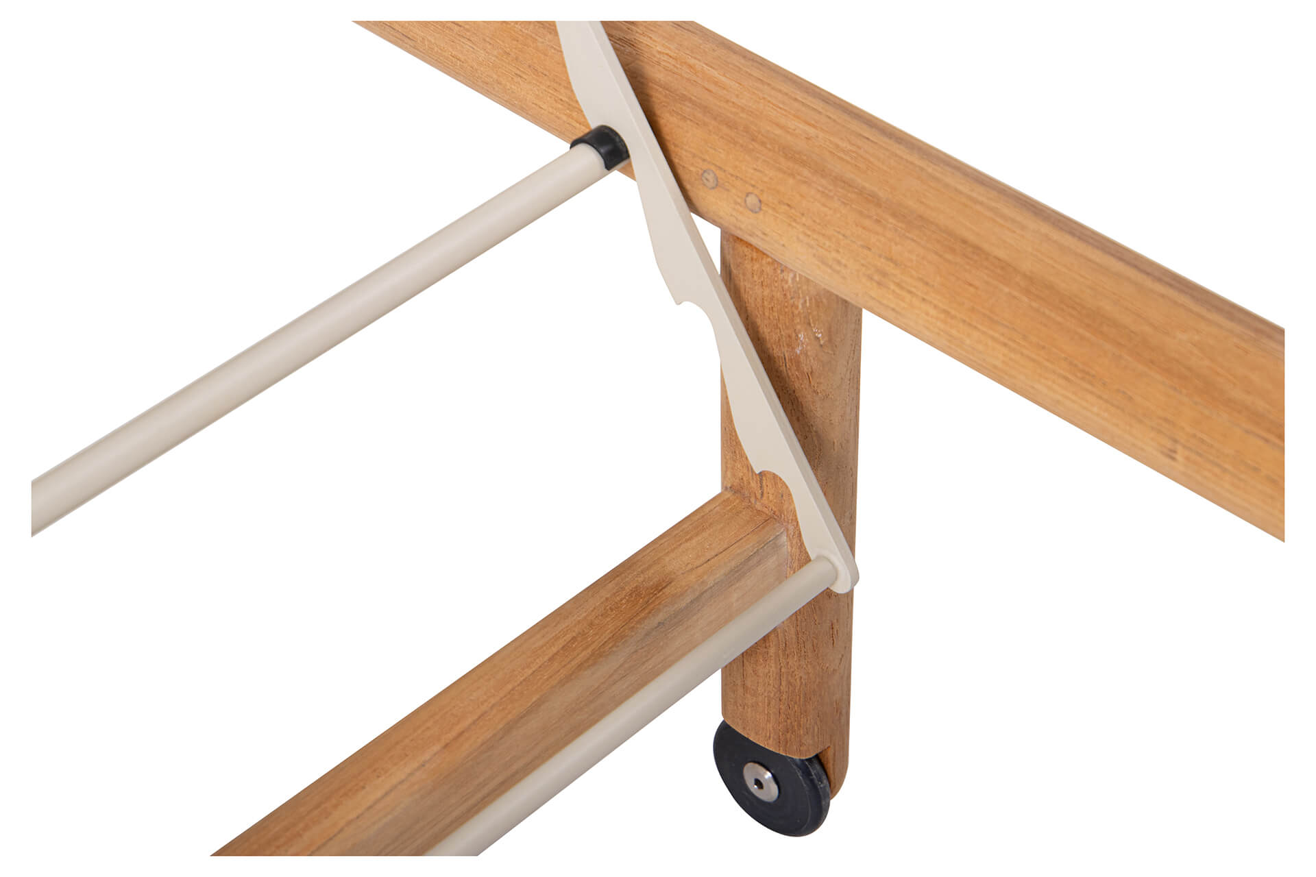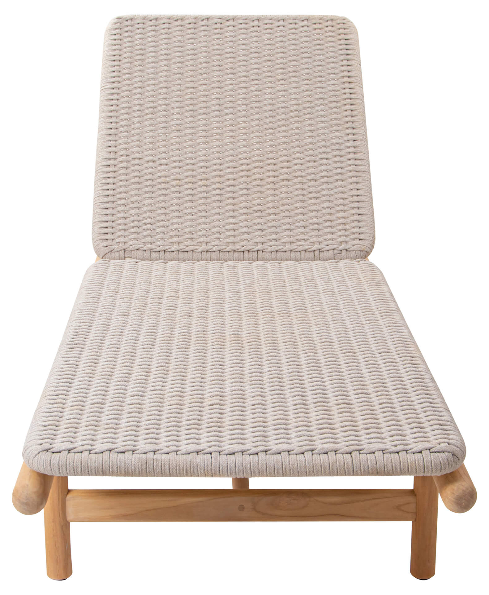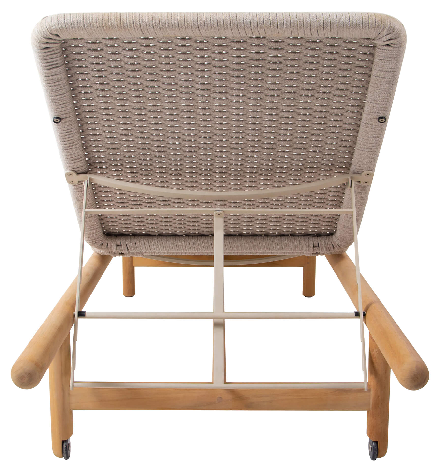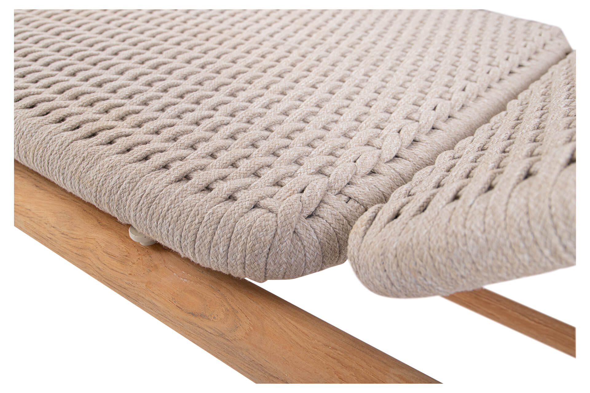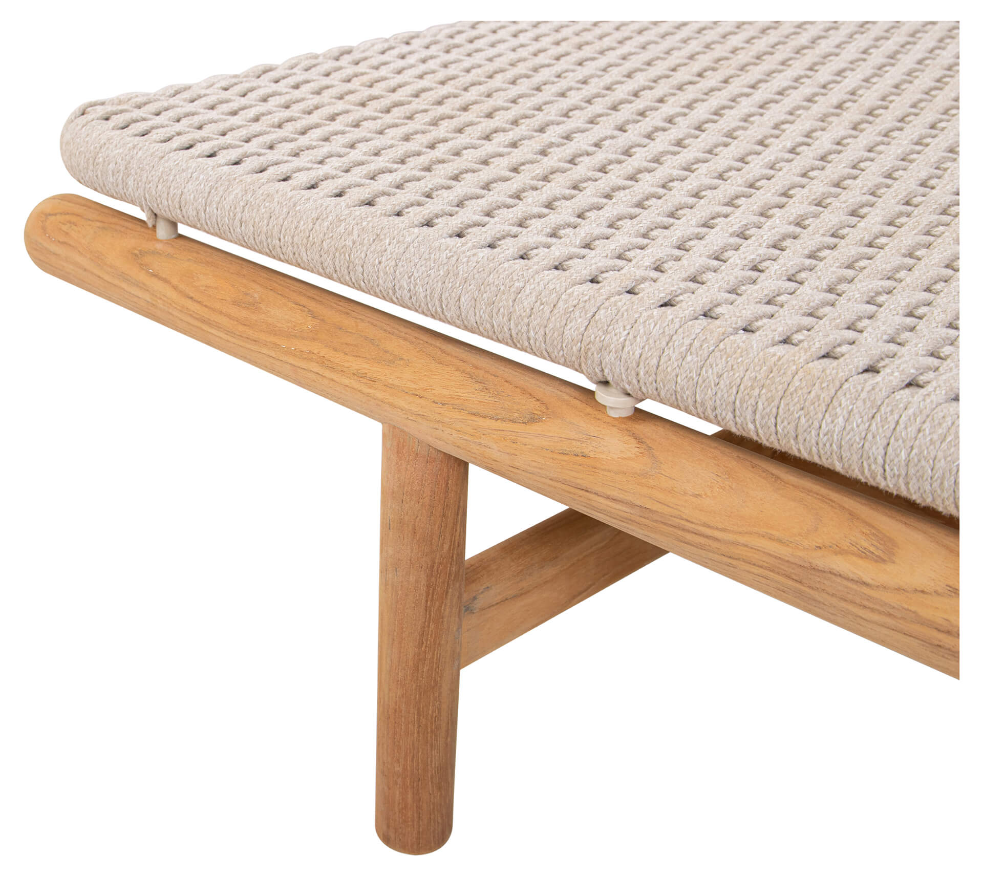 Das Gestell aus edlem Teakholz verleiht der Liege eine warme und zeitlose Optik. Rücken- und Liegefläche sind mit einem Rope-Geflecht in der Farbe linnen bespannt, das hohen Liegekomfort bietet.