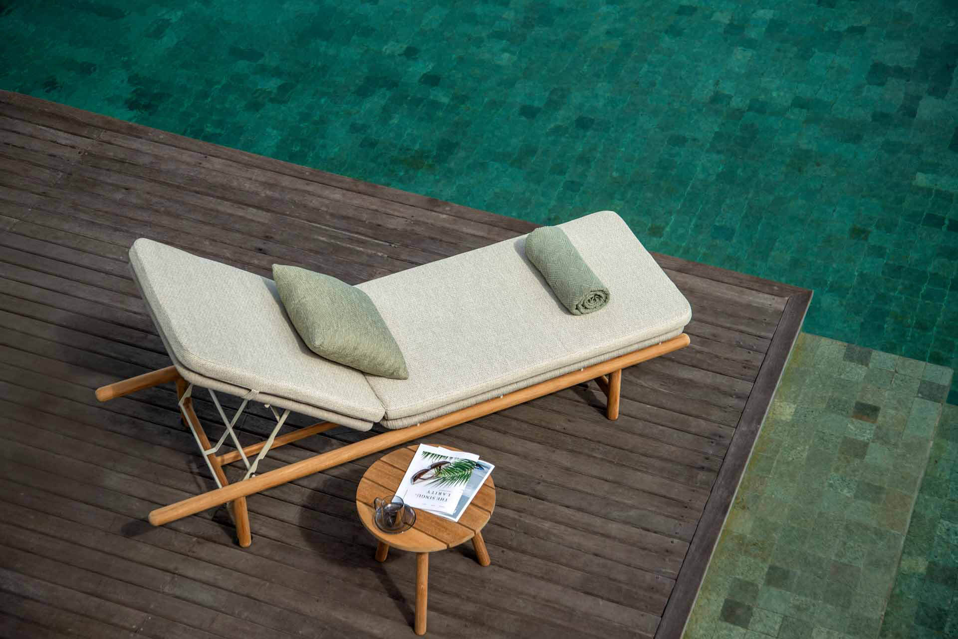 Die Benoa Sonnenliege mit Rollen von Jati&Kebon vereint natürlichen Charme mit modernem Komfort. Sie ist die perfekte Ergänzung für Ihre Außenbereiche.