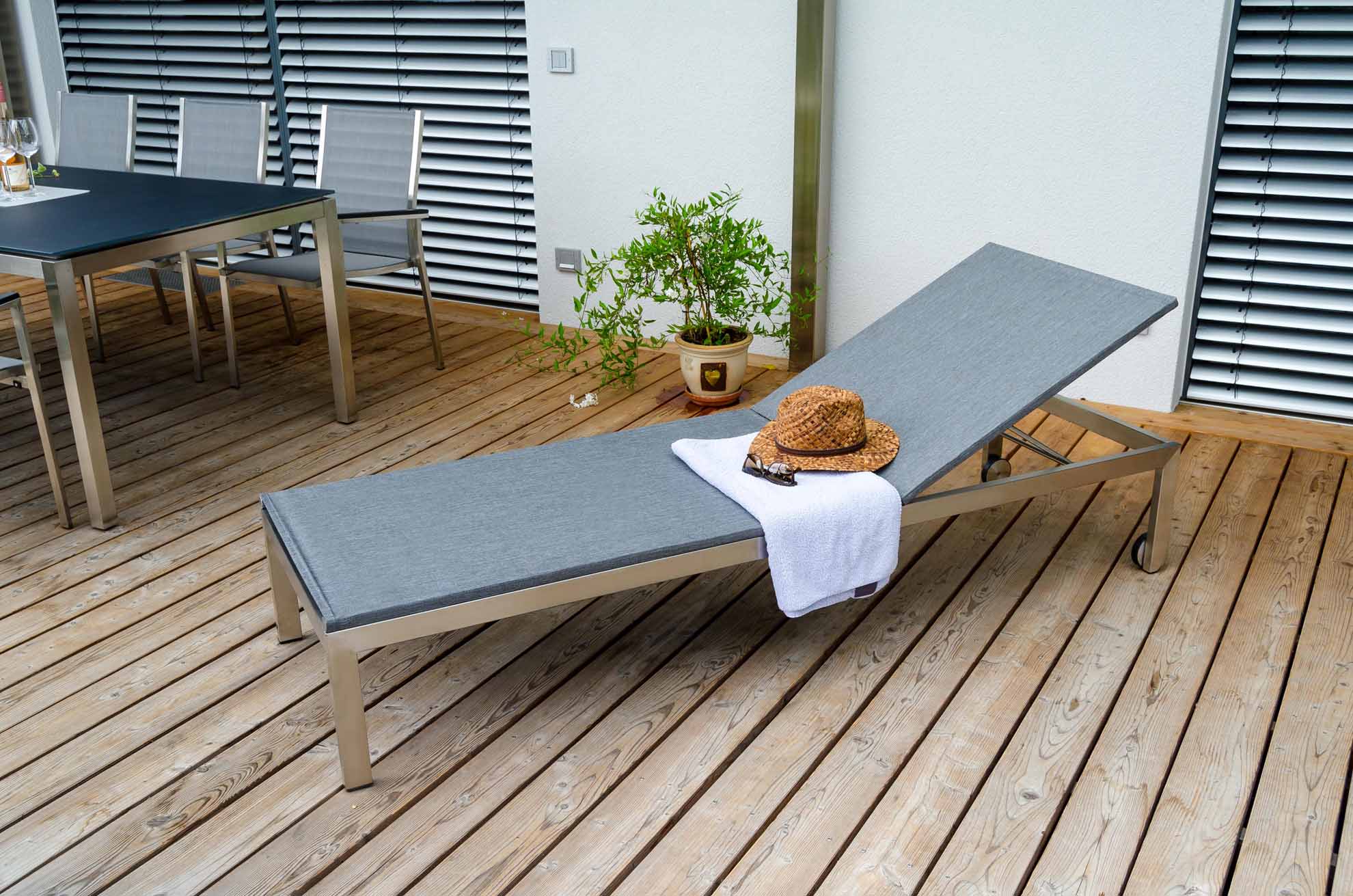 Gartenmöbel aus Edelstahl sind nicht nur wetterbeständig, sondern auch äußerst strapazierfähig. Das Material ist sehr stabil, deshalb können Edelstahl-Gartenmöbel mit viel kleineren Profilen hergestellt werden und wirken deutlich filigraner als andere Materialien. Die gebürstete Oberfläche verleiht dem Möbelstück eine exklusive Anmutung. Edelstahl ist unempfindlich gegen Schäden durch Anstoßen und Verkratzen, da die Oberfläche nicht lackiert ist. Kleine Beschädigungen können einfach mit einem metallfreien Reinigungsvlies bearbeitet werden. Die Edelstahl-Gartenmöbel in unserem Sortiment sind nicht für den Einsatz in Hallenbädern oder in Küstennähe am Meer geeignet!
