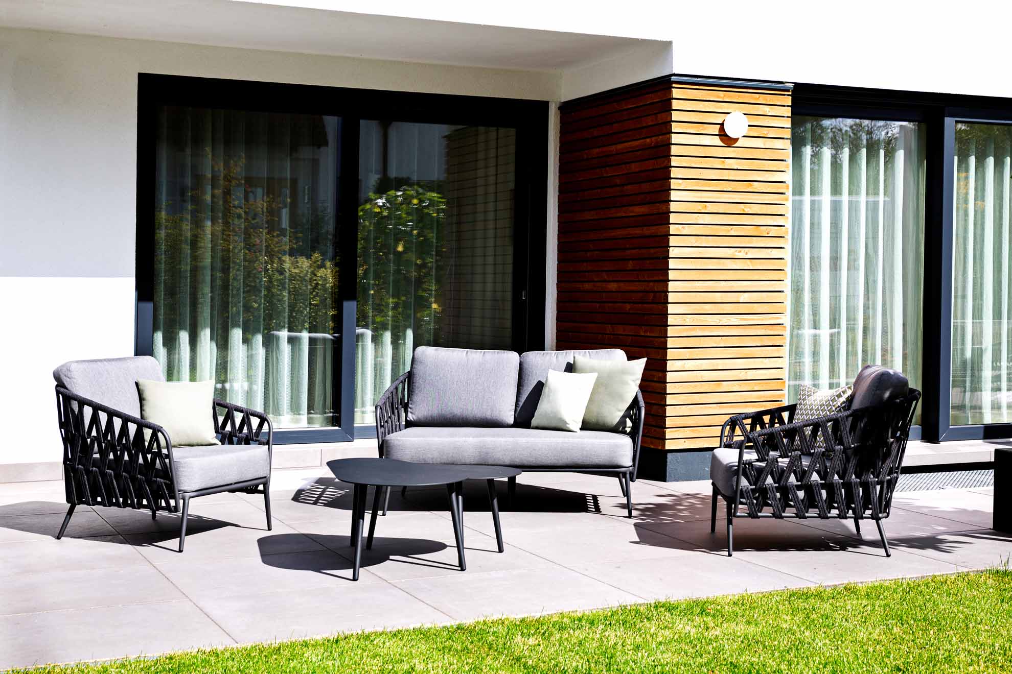 Der Palm Lounge Sessel von Jati & Kebon mit schwarzer Cross Flechtung. Ganz nach Ihren Bedürfnissen kann der Sessel zu den Modulen mit Cross Flechtung kombiniert werden, um so eine für Sie passende Loungegruppe zu gestalten. Der pulverbeschichtete Aluminiumrahmen bildet das Grundgerüst des Palm-Sessels und die hochwertige Seil Geflecht aus Polypropylen Seilen umspannt harmonisch dieses stabile Gestell. Durch die wetterfesten Seile können die Möbel im Freien bleiben, lediglich für die Kissen empfiehlt sich eine Abdeckung oder das Verstauen in einer Kissenbox. Kissen sind im Zubehör bestellbar.
