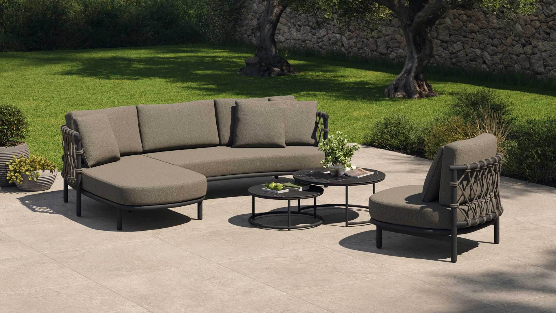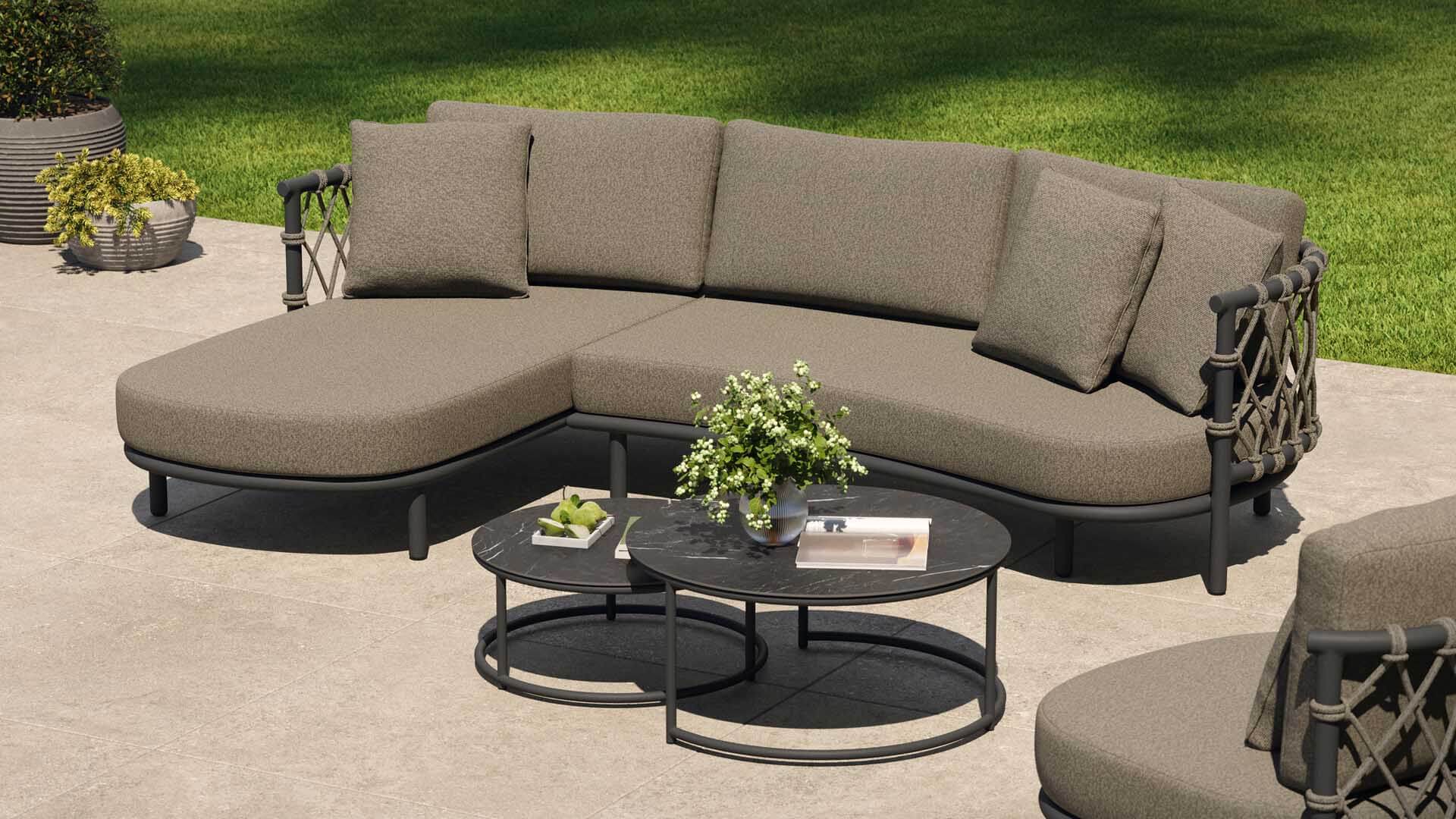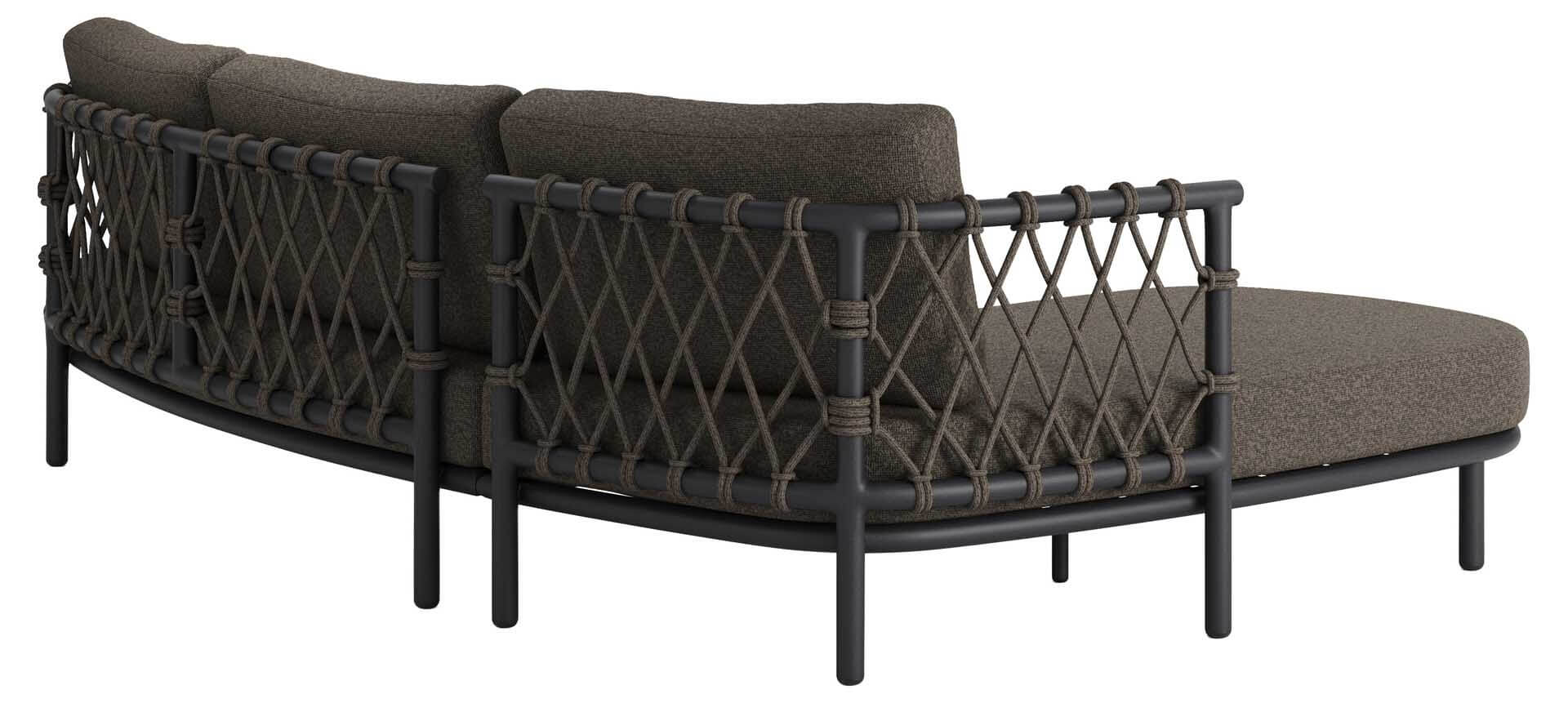 Das Mezzo Recamieren-Set rechts ergänzt die modulare Mezzo Kollektion von Jati & Kebon um ein großzügiges Loungeelement mit seitlichem Rope-Geflecht auf der rechten Seite. Das stabile Aluminiumgestell in eisengrau sorgt für langlebige Wetterbeständigkeit, während das kunststoffgeflecht in mocca dem Modul seine markante und zugleich warme Optik verleiht.