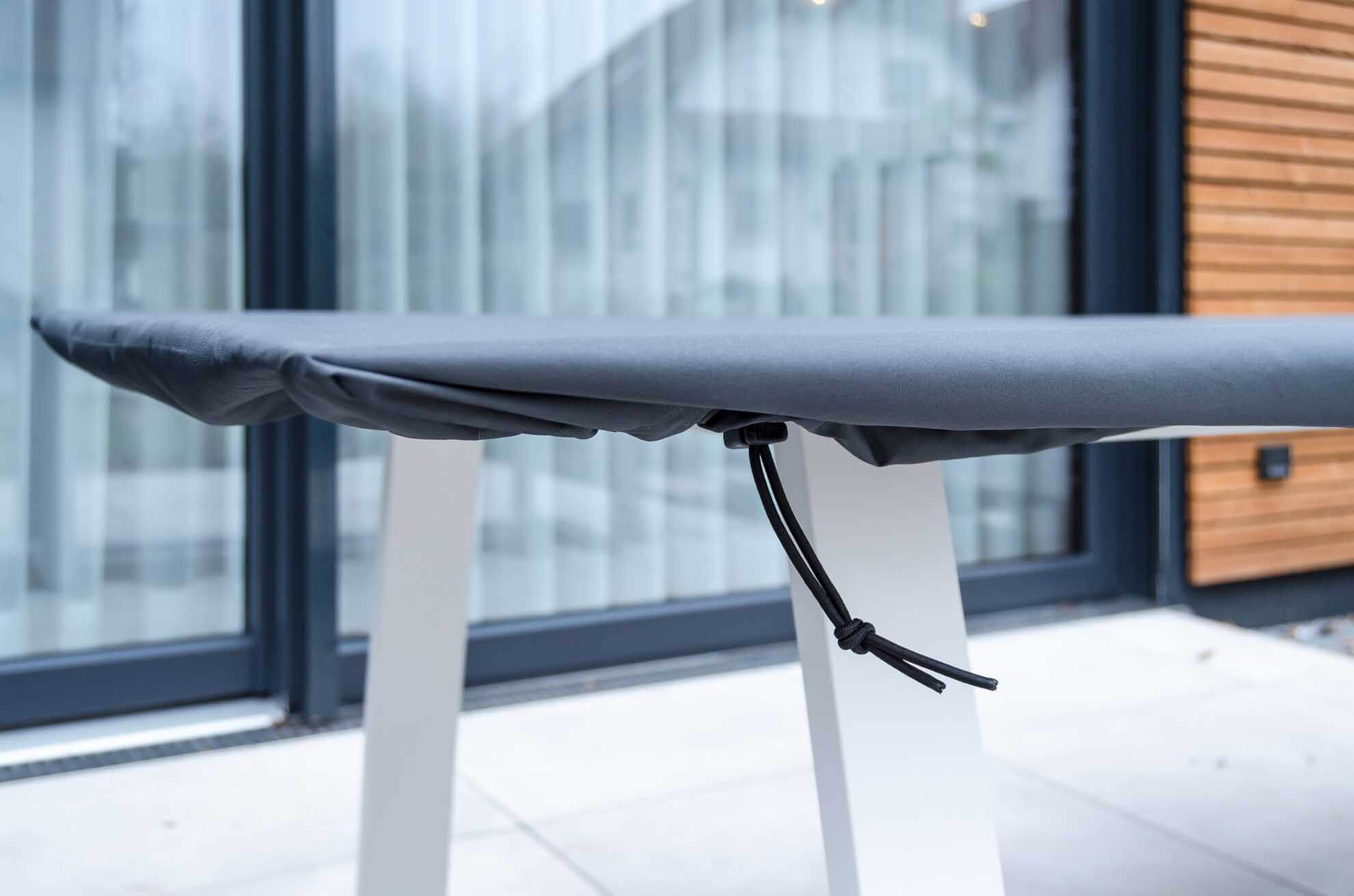 - Stellen Sie sicher, dass die Gartenmöbel vollständig trocken sind, bevor Sie die Schutzhülle anbringen. Feuchtigkeit, die bereits vorhanden ist, kann unter der Hülle eingeschlossen werden und zu Kondensation führen.