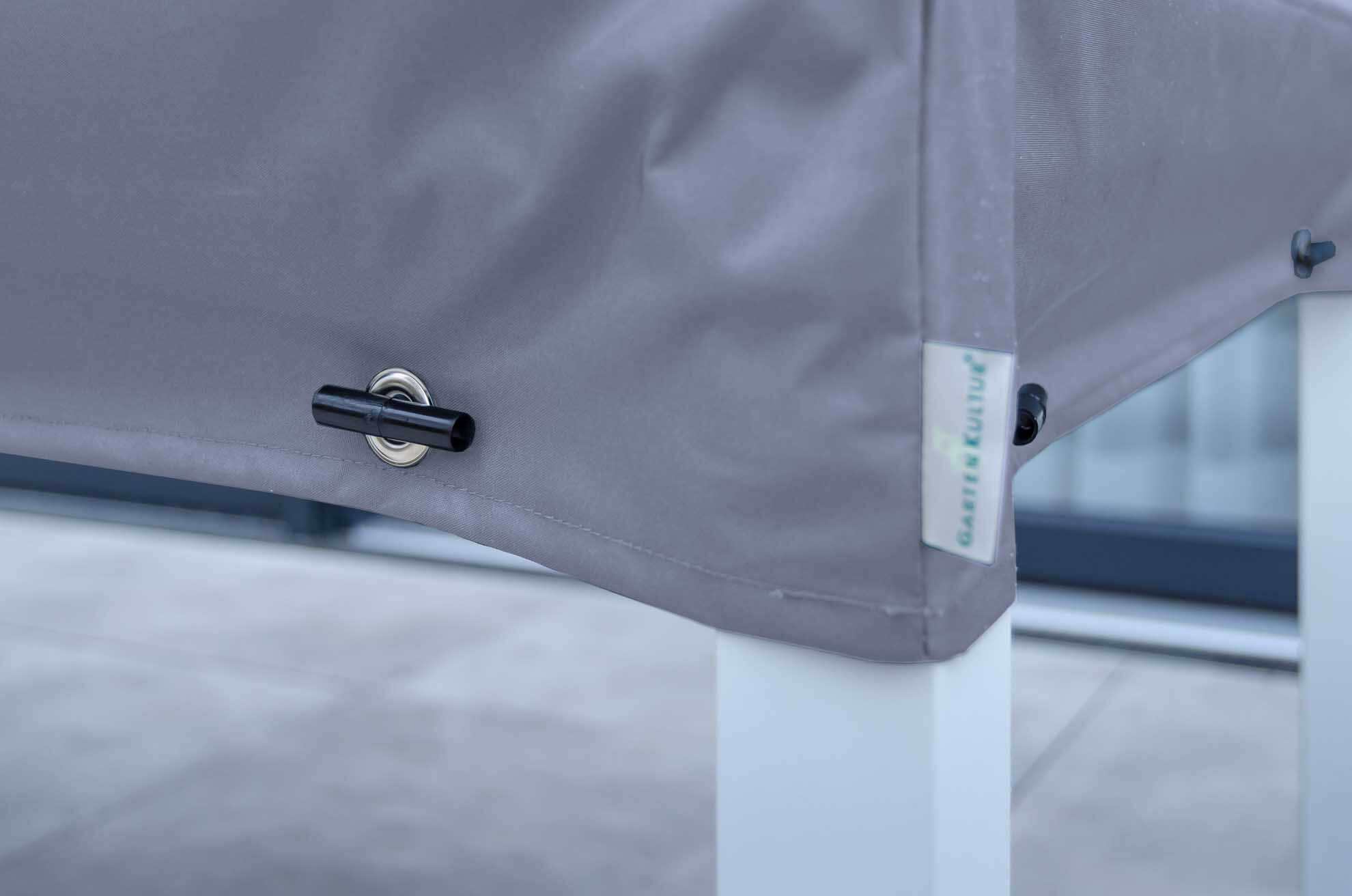 Das graue, speziell beschichtete SILK Material bietet optimalen Schutz für alle Gartenmöbel. SILK ist nicht nur extrem wasserabweisend, sondern auch atmungsaktiv. Durch wechselnde Temperaturen entstandenes Kondenswasser kann problemlos wieder abtrocknen. Damit werden Ihre Möbel vor Feuchtigkeit und somit Schimmelbildung, Stockflecken und Fäulnis geschützt.